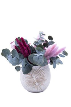 Elegante jardinera de cerámica con flores artificiales en tonos crudos y rosas empolvados
