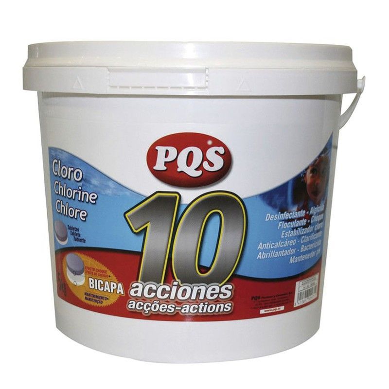 Cloro para piscina PQS 10 Acciones Bicapa, en bote de 5 kg. Ideal para mantener el agua limpia, clara y segura. Actúa como desinfectante, floculante, estabilizante y más. Fórmula bicapa para mayor eficacia y durabilidad. Perfecto para piscinas residenciales y spas. Uso recomendado según instrucciones del envase.