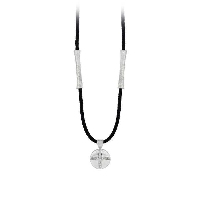 Colgante de piel decorado con plata, ideal para adultos que buscan un accesorio sofisticado y versátil. Diseño circular con cruz en relieve, combinado con una cuerda negra y terminales plateados. Perfecto para looks casuales o formales, añade un toque de estilo y elegancia a tu atuendo diario.