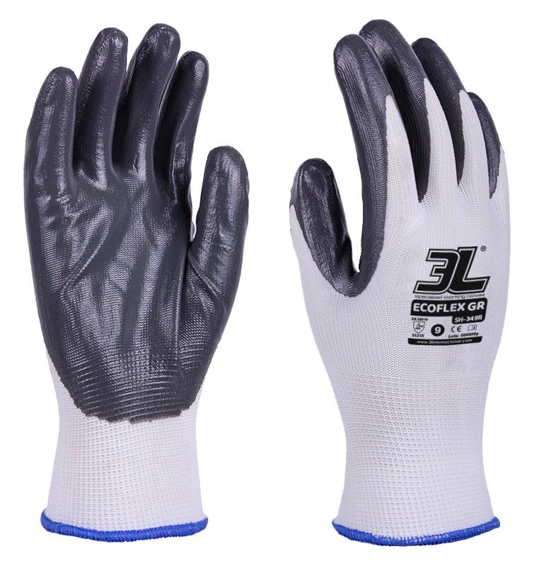 Guantes de seguridad de nitrilo gris sin costuras, ideales para trabajos que requieren agarre y protección. Confeccionados con revestimiento de nitrilo en palma y dedos para mayor resistencia y comodidad, y muñequera de tejido blanco con ribete azul. Ligeros y flexibles, perfectos para trabajos en construcción, mantenimiento o industria. Diseño erg