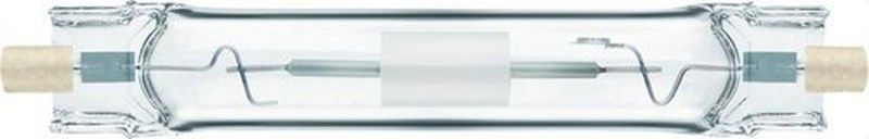 Lámpara Philips MasterColour CDM-TD 150W/830, ideal para iluminación profesional con luz cálida y alta calidad de color. Diseño cilíndrico de vidrio transparente con electrodos metálicos y extremos de plástico. Perfecta para aplicaciones comerciales y residenciales que requieren iluminación eficiente y duradera.