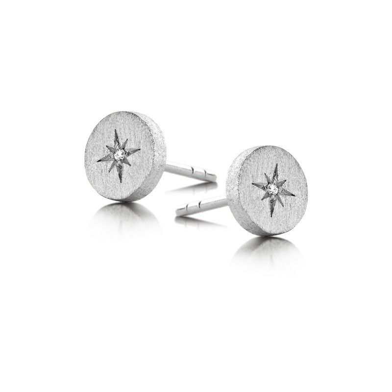 Pendientes circulares en plata con diseño de estrella grabada y pequeño diamante en el centro. Acabado mate con brillo sutil, ideales para un look elegante y discreto. Perfectos para mujeres que buscan joyas sofisticadas y versátiles para diario o ocasiones especiales.