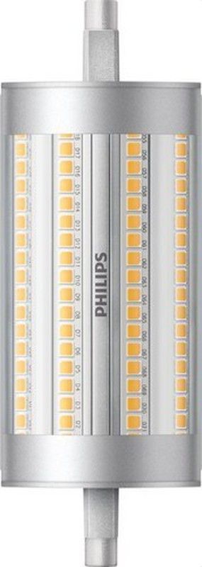 Lámpara LED Philips CorePro R7s de 118 mm, ideal para iluminación interior y exterior. Con tecnología LED regulable y luz cálida (830), ofrece un rendimiento eficiente y duradero. Diseño cilíndrico con diodos amarillos visibles y carcasa metálica plateada. Perfecta para sustituir bombillas halógenas de hasta 150W. Ideal para focos empotrados, lámpa