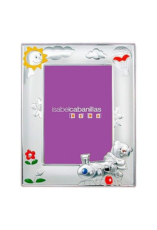 Marco para fotos de bebé de Isabel Cabanillas, con diseño infantil en metal plateado. Ideal para guardar recuerdos de tu pequeño con detalles como sol, nubes, tren y oso. Acabado brillante y colores vivos. Perfecto para decorar el cuarto del bebé o como regalo especial.