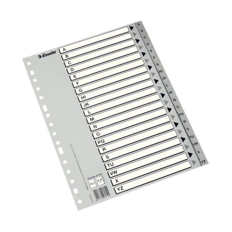 Abecedario multitaladro Esselte. Folio. Cartulina índice B/N. A-Z PP, gris