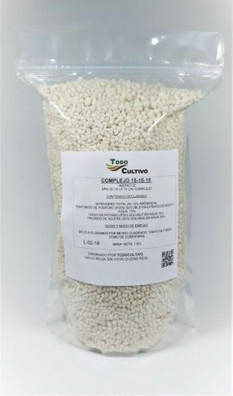 Abono fertilizante 15-15-15 en gránulos para jardín y cultivos. Fórmula equilibrada con nitrógeno, fósforo y potasio para un crecimiento saludable de plantas. Ideal para jardinería, huertos y macetas. Envase de plástico transparente con etiqueta informativa. Peso neto 1 kg. Perfecto para mejorar la fertilidad del suelo y potenciar el desarrollo de