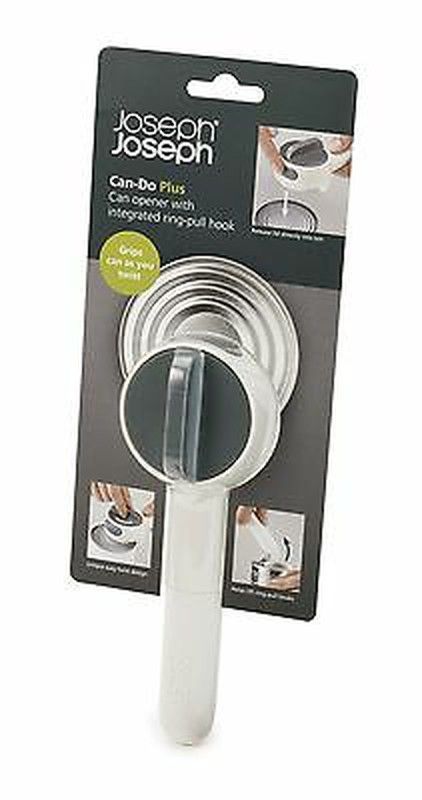 Abrelatas 2 en 1 Can-Do Plus de Joseph Joseph, fabricado en acero inoxidable y plástico resistente. Diseño ergonómico con gancho integrado para abrir latas tipo ring-pull. Ideal para cocinas modernas, fácil de usar y limpiar. Perfecto para ahorrar tiempo y esfuerzo al abrir conservas.