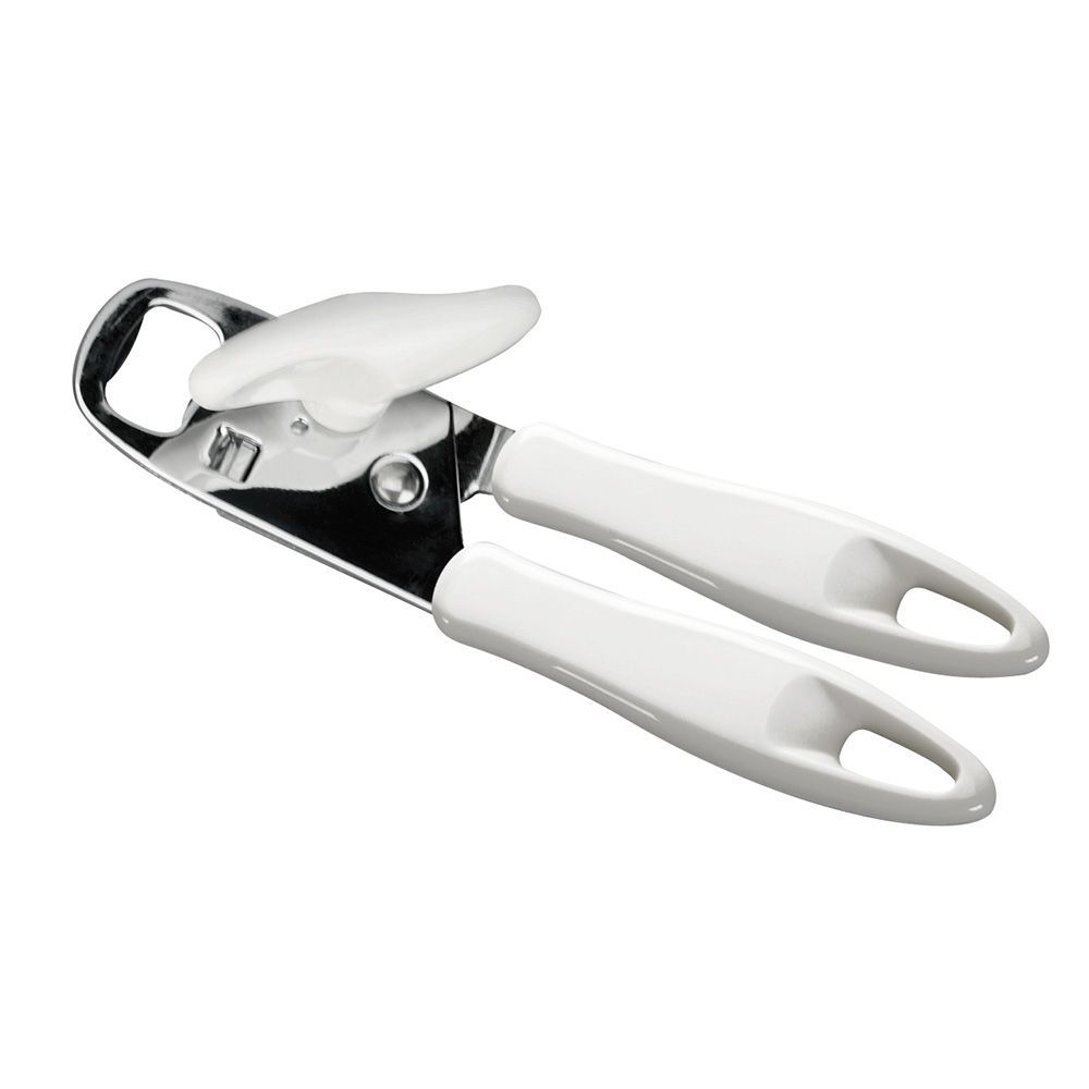 Abrelatas Palomilla Presto de Tescoma, con manijas blancas de plástico y cuerpo de acero inoxidable. Diseño ergonómico y fácil de usar para abrir latas con comodidad. Ideal para cocinas modernas y uso diario. Resistente y duradero, garantiza una apertura segura y sin esfuerzo.