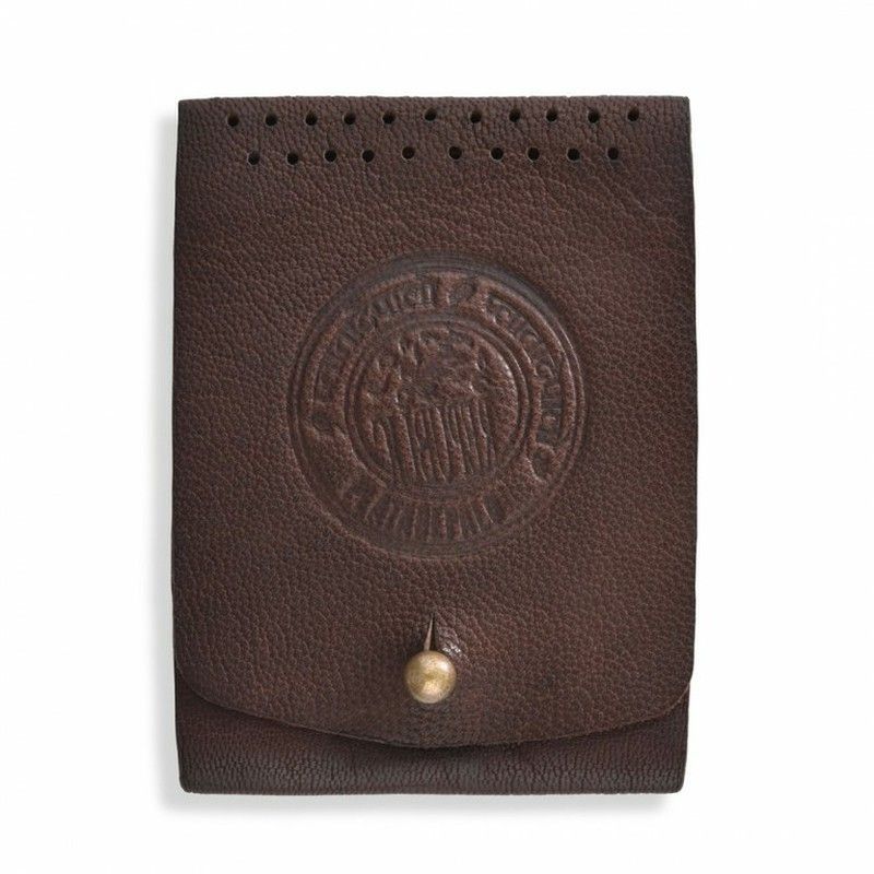 Tarjetero de cuero marrón con cierre de botón dorado, ideal para adultos que buscan elegancia y funcionalidad. Con diseño clásico, perforaciones decorativas en la parte superior y sello grabado en el centro, este accesorio combina estilo y calidad. Perfecto para llevar tarjetas de forma organizada y segura.