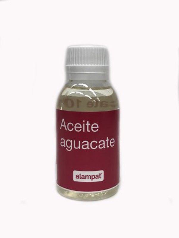 Aceite de aguacate puro de 125 ml en botella de vidrio transparente con tapa de plástico blanco. Ideal para cuidado de la piel y cabello, gracias a sus propiedades nutritivas y antioxidantes. Producto de la marca alampat, perfecto para uso diario en rutinas de belleza y salud.