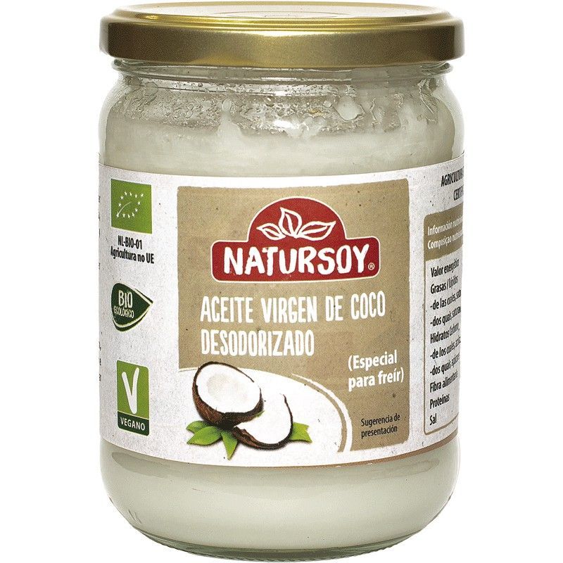 Aceite virgen de coco desodorizado de Natursoy, en frasco de 400 g. Ideal para freír y cocinar sin sabor a coco. Certificado ecológico y vegano, con etiquetado claro y diseño natural. Perfecto para uso diario en cocina saludable.