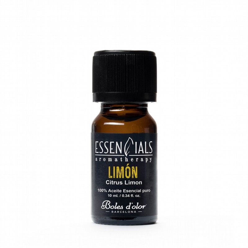 Aceite esencial puro de limón (Citrus Limon) de 10 ml, ideal para aromaterapia en el hogar. 100% puro y natural, en frasco de vidrio ámbar con tapa negra. Perfecto para difusores, masajes o ambientadores. De la marca Boles d'Olor Barcelona, reconocida por su calidad y pureza.