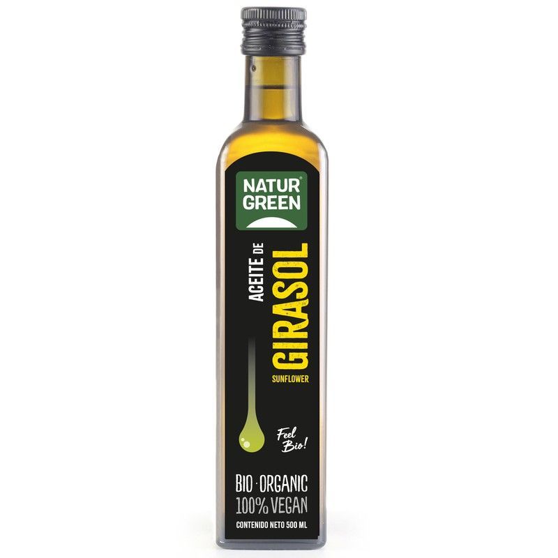Aceite de girasol ecológico y vegano de 500 ml, ideal para cocinar, saltear o aliñar ensaladas. Producido por Natur Green, este aceite de alta calidad es 100% orgánico y libre de aditivos. Su botella de vidrio protege el producto y mantiene su sabor puro. Perfecto para dietas saludables y cocinas conscientes.