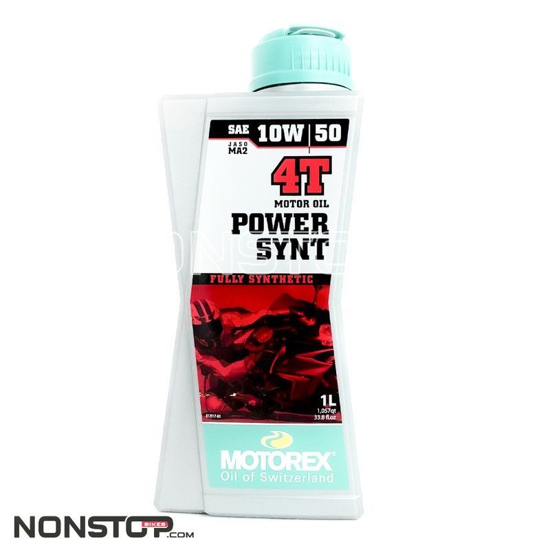 Aceite motor 4T Motorex Power Synt 10W50, 1 litro, totalmente sintético para motores de 4 tiempos. Ideal para motocicletas y vehículos motorizados que requieren alta protección y rendimiento. Fabricado en Suiza, ofrece una excelente lubricación y resistencia al calor. Envase práctico y fácil de usar.