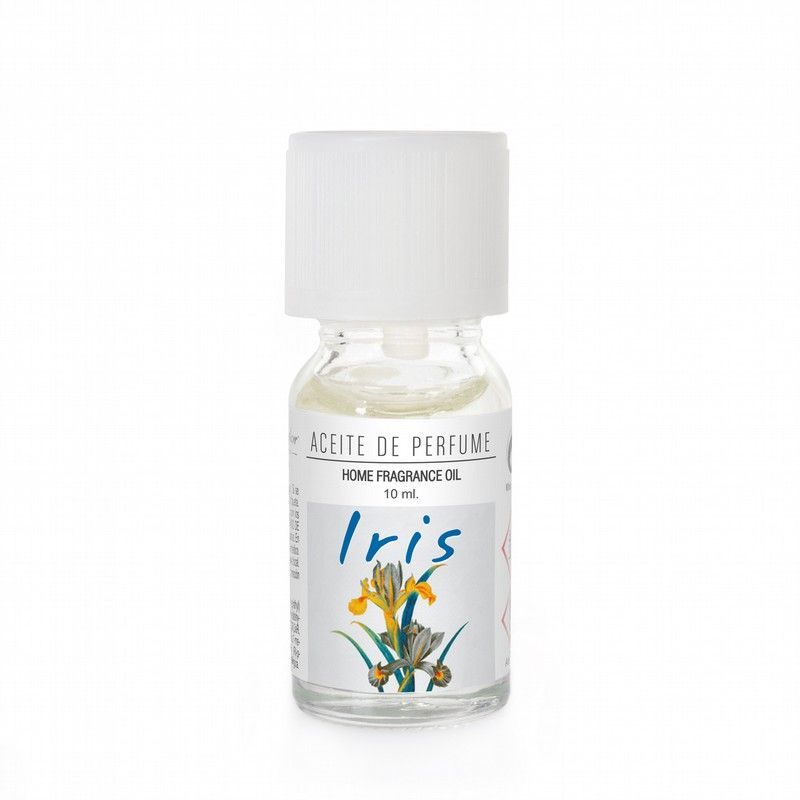 Aceite perfumado para el hogar con aroma a iris, ideal para difusores o ambientadores. En frasco de 10 ml con etiqueta decorativa que muestra ilustración de flores de iris. Perfecto para crear un ambiente fresco y elegante en tu hogar. Producto de alta calidad para uso doméstico.