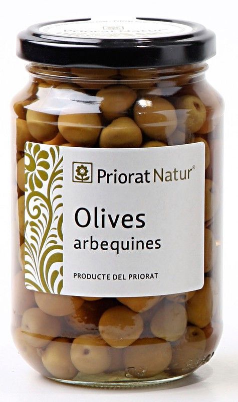 Aceitunas arbequines de la Denominación de Origen Priorat, en frasco de vidrio transparente con tapa negra. Ideales para acompañar quesos, ensaladas o como aperitivo gourmet. Producto natural y de alta calidad, perfecto para amantes de la gastronomía mediterránea.