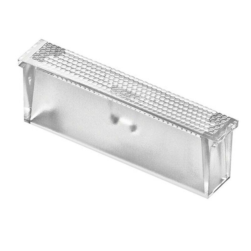 Caja rectangular de plástico transparente con tapa texturizada en diseño de malla hexagonal, ideal para almacenar accesorios de iluminación o pequeños componentes. Su acabado brillante y diseño funcional la hacen perfecta para mantener organizados elementos de decoración o instalaciones de luz. Fácil de usar y resistente.