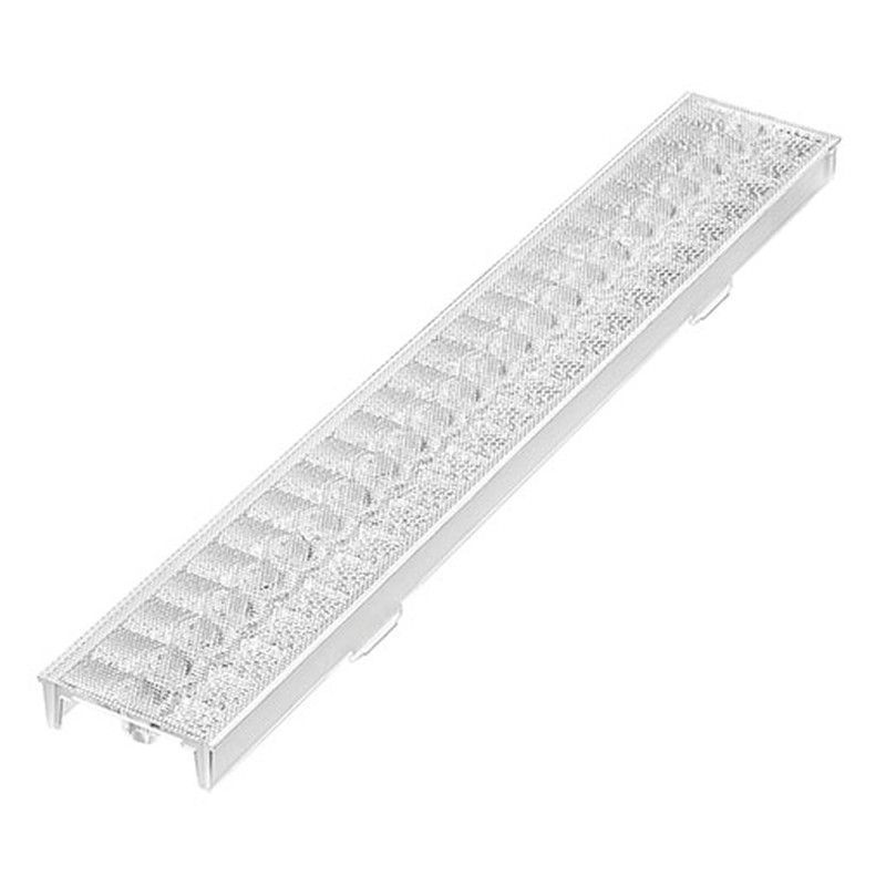 Lente rectangular Acl de 43 x 280 mm para iluminación LED, con acabado blanco y textura de rejilla para difusión uniforme de luz. Fabricado en plástico y acero inoxidable, ideal para instalaciones en techos o paredes. Diseño asimétrico para una distribución óptima de la luz en espacios interiores. Perfecto para proyectos de iluminación funcional y