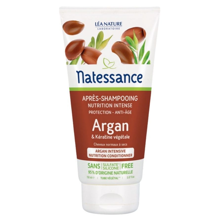 Acondicionador nutritivo Natessance con aceite de argán y queratina vegetal, ideal para cabellos normales y secos. Fórmula intensiva que protege y retrasa el envejecimiento capilar. Sin sulfatos ni siliconas, con 95% de ingredientes de origen natural. Textura suave y fácil de aplicar. Para un cabello más fuerte, sedoso y con brillo. 150 ml.