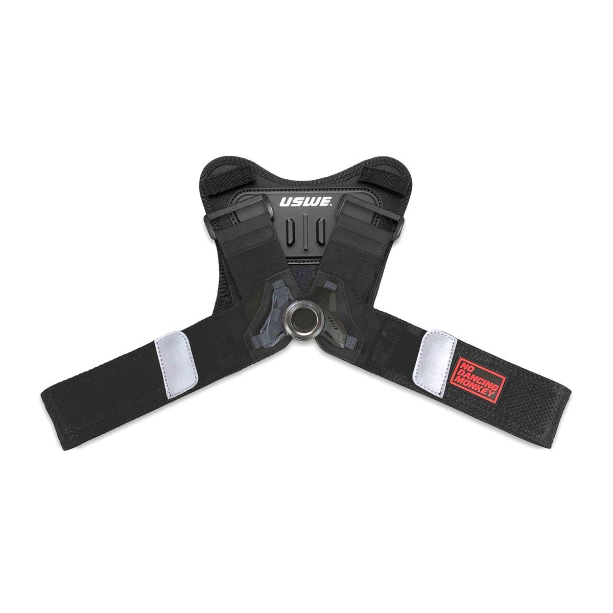 Arnés para cámara de acción USWE, tamaño M-XL, en color negro con detalles blancos y rojos. Fabricado en poliéster resistente y con cintas ajustables para un ajuste seguro. Incluye anilla metálica central para montar cámaras y bandas reflectantes para mayor visibilidad. Ideal para ciclistas y deportistas que buscan grabar sus aventuras con comodida