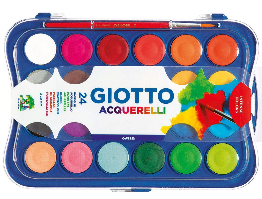 Juego de acuarelas Giotto con 24 colores vibrantes en estuche práctico, ideal para niños. Incluye pincel y está diseñado para fomentar la creatividad. Perfecto para dibujar, pintar y colorear en casa o en clase. Fácil de usar y transportar gracias a su estuche compacto.