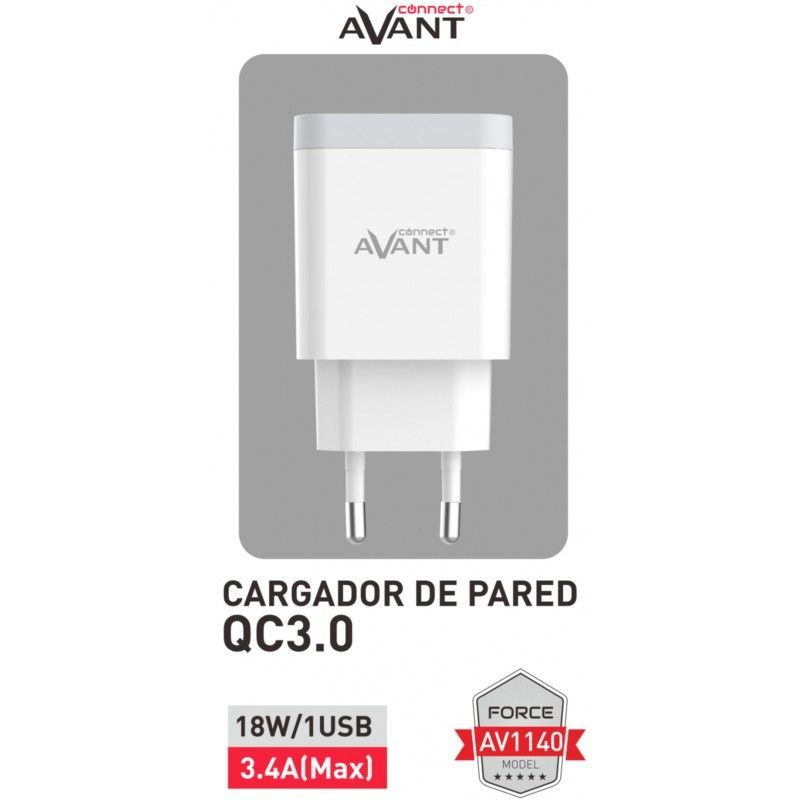 Cargador de pared Avant Connect QC3.0 de 18W con puerto USB, ideal para cargar dispositivos móviles rápidamente. Diseño compacto y elegante en color blanco, fabricado en plástico y metal. Perfecto para uso diario en casa, oficina o viajes. Incluye tecnología de carga rápida para ahorrar tiempo.