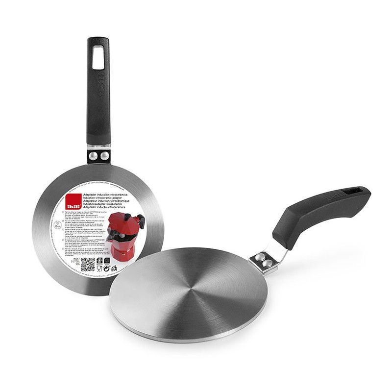 Adaptador para cafeteras de 12 cm de diámetro, fabricado en acero inoxidable de alta calidad. Ideal para usar cafeteras tradicionales en placas de inducción. Diseño robusto con mango negro y base pulida, fácil de limpiar y resistente al calor. Perfecto para amantes del café que buscan compatibilidad y durabilidad.
