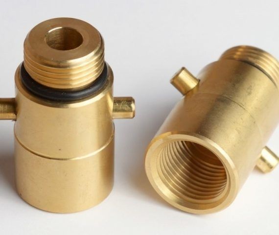 Adaptador de metal dorado con rosca W21.8 y conexión bayoneta corta, ideal para sistemas de escape o tuberías en vehículos. Fabricado en metal resistente con anillo de goma negro para un sellado seguro. Diseño compacto con salidas laterales para conexiones precisas. Perfecto para mantenimiento y reparaciones en automóviles.