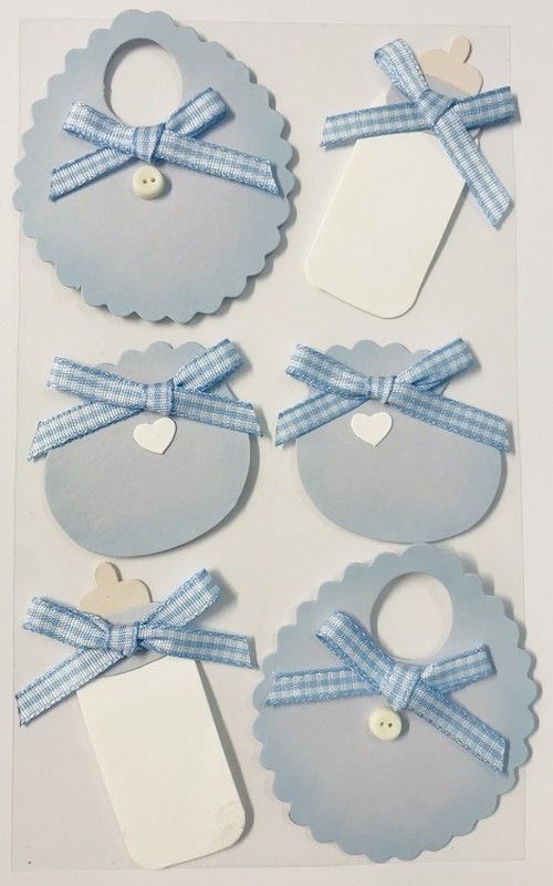 Adhesivos decorativos en forma de babero, patucos y biberón en tonos azul claro y blanco, con lazos de tela a cuadros y detalles con botones y corazones. Hechos en cartón, ideales para decorar regalos, tarjetas o álbumes de bebé. Perfectos para baby showers o celebraciones infantiles con estilo delicado y elegante.