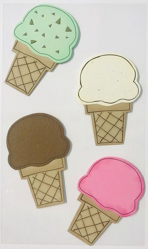 Adhesivos decorativos en forma de cucuruchos de helado, ideales para manualidades y proyectos creativos. Hechos de cartón con acabado detallado en colores verde, blanco, marrón y rosa, con conos con diseño de rejilla. Perfectos para decorar tarjetas, álbumes, scrapbooking o como elementos decorativos en fiestas infantiles. Fáciles de usar y con un