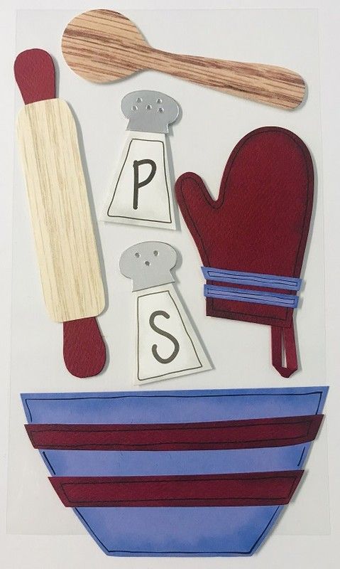 Adhesivo decorativo 'Haciendo Pasteles' ideal para manualidades infantiles. Diseño divertido con rodillo, cuchara, guante de horno, salero y pimentero, y tazón en colores azul y rojo. Hecho en cartón, perfecto para proyectos creativos en casa o en clase. Fomenta la imaginación y el juego simbólico en niños.