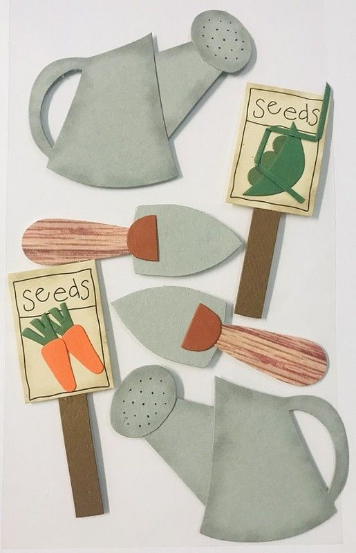 Adhesivo decorativo de jardinería en cartón, ideal para manualidades infantiles. Incluye regaderas, palas y paquetes de semillas con diseño de zanahoria y lechuga. Perfecto para proyectos creativos, decoración de cuadros o juegos educativos. Fácil de usar y con acabado detallado en colores naturales.