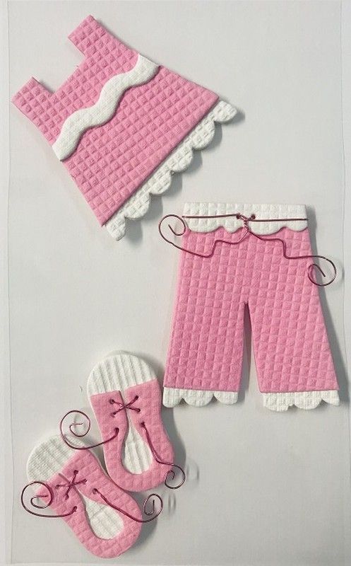 Adhesivo decorativo 'Todo de Rosa' con diseño de conjunto de ropa para muñecas: top, pantalones cortos y zapatillas en tonos rosa y blanco. Ideal para manualidades infantiles, álbumes, scrapbooking o decoración de tarjetas. Hecho con textil de textura cuadriculada y detalles en hilo rosa. Perfecto para proyectos creativos con niños.