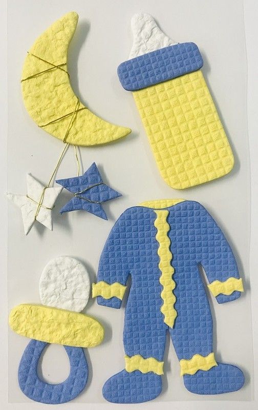 Adhesivo decorativo 'Vamos a la Cama' ideal para álbumes, tarjetas y manualidades infantiles. Con formas de luna, estrellas, biberón, pijama y chupete en tonos azul, amarillo y blanco. Hecho en cartón con textura cuadriculada, perfecto para proyectos creativos con bebés y niños pequeños. Fácil de aplicar y con diseño temático de sueño.