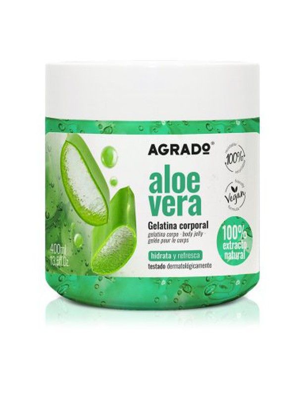 Gelatina corporal Aloe Vera de Agrado, con 100% extracto natural, hidrata y refresca la piel. Ideal para uso diario, dermatológicamente testada y vegana. En bote de 400g con diseño fresco y verde, perfecta para mantener la piel suave y revitalizada.
