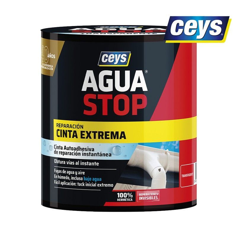 Cinta Extrema Agua Stop de Ceys, solución instantánea para reparar fugas de agua y aire en tuberías y conexiones. Hermética al 100%, se aplica fácilmente incluso bajo agua y en superficies húmedas. Ideal para reparaciones rápidas y eficaces en el hogar. Cinta autoadhesiva de alta resistencia, perfecta para uso en jardín, baño o cocina.
