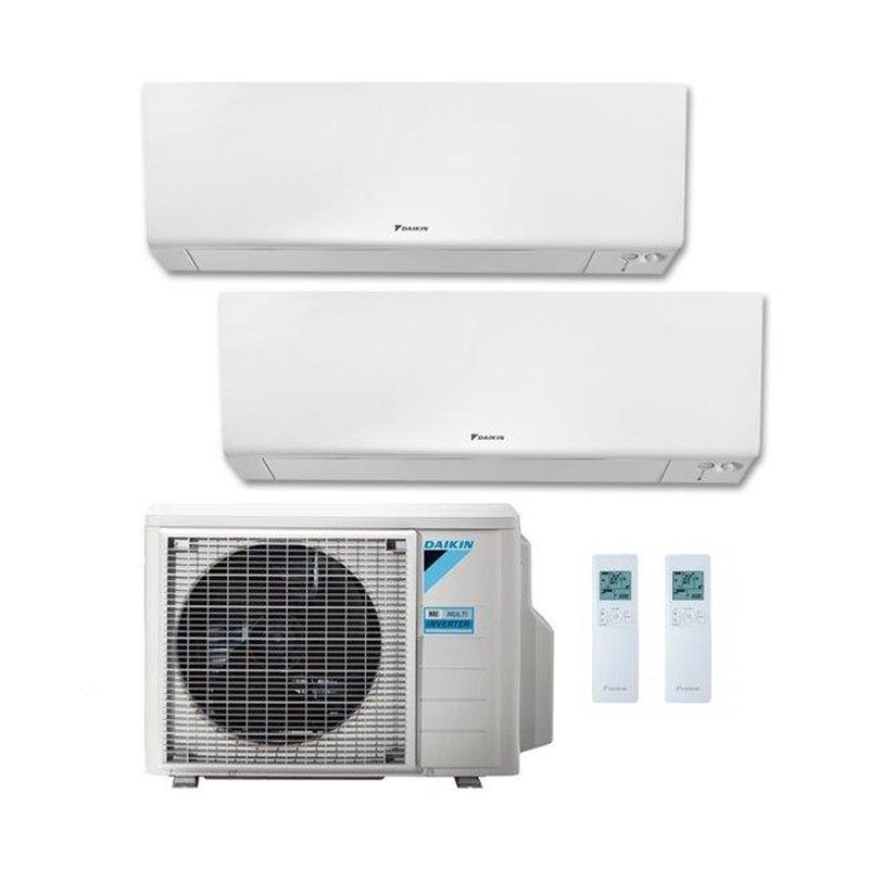 Aire acondicionado Daikin Multisplit 2MXP50M3 (35+35) con dos unidades interiores blancas y una exterior gris, ideal para climatizar dos espacios simultáneamente. Tecnología inverter para mayor eficiencia energética y silencio. Incluye dos mandos a distancia con pantalla digital. Diseño moderno y compacto, perfecto para hogares y oficinas. Calidad