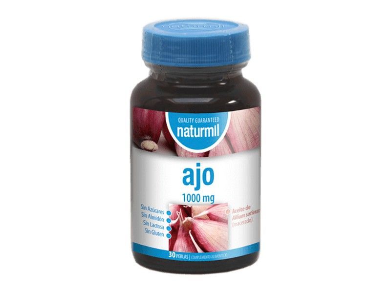 Suplemento de ajo 1000 mg en 30 perlas, de la marca naturmil. Ideal para apoyar la salud cardiovascular y el sistema inmunológico. Sin aditivos, sin lactosa ni gluten. Envasado en bote de plástico con tapa azul y etiqueta con diseño de dientes de ajo. Perfecto para adultos que buscan una nutrición natural y de calidad.