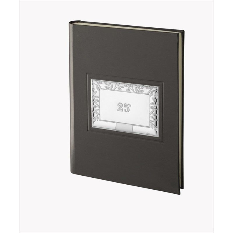 Álbum de fotos conmemorativo para el 25º aniversario, ideal para guardar recuerdos especiales. Con portada en piel sintética negra y placa metálica decorativa con diseño de hojas y el número '25' grabado. Perfecto para regalar en bodas de plata o celebraciones importantes. Dimensiones 24x30 cm.