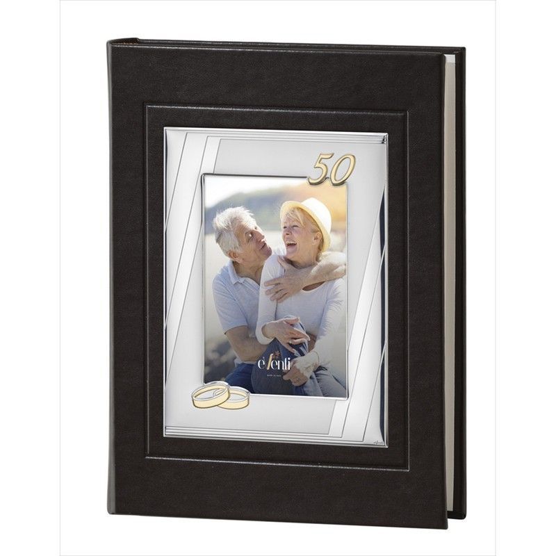 Álbum de fotos conmemorativo para el 50º aniversario de boda, ideal para parejas mayores. Con tapa negra elegante y detalles dorados, incluye marco interior plateado con el número '50' y anillos de boda en relieve. Perfecto para guardar recuerdos especiales en un formato de 24x30 cm. Material resistente y diseño sofisticado para celebrar medio sigl