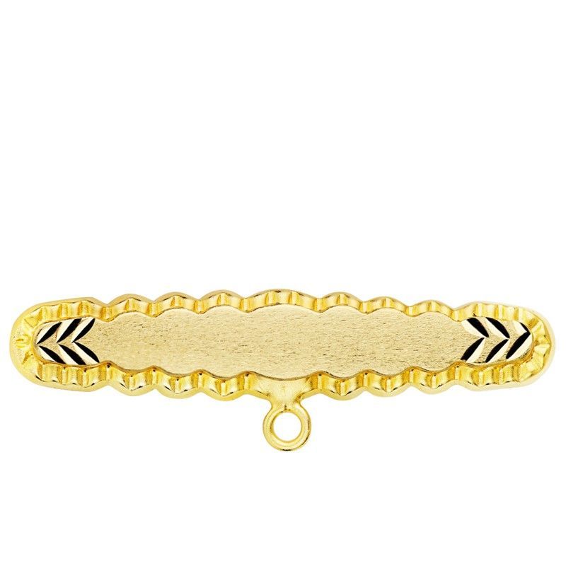 Alfiler para bebé en oro 18kts con acabado tallado y detalles en negro. Diseño elegante con borde ondulado y anilla para fácil uso. Ideal para prendas de vestir infantiles, combinando calidad y estilo. Perfecto para ocasiones especiales o uso diario.