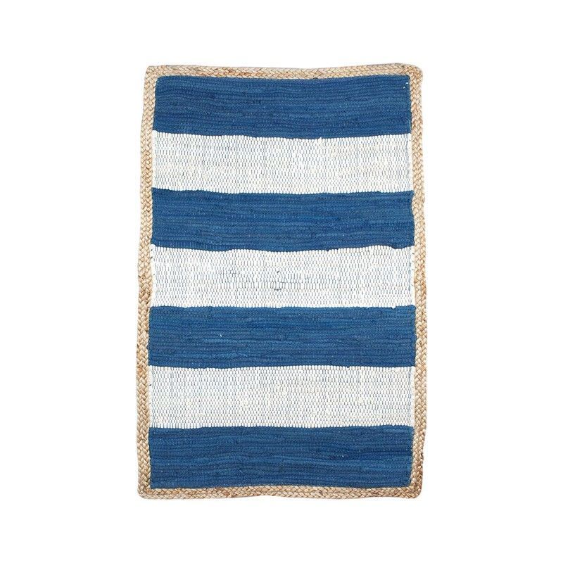 Alfombra rectangular de 60x90 cm con diseño de rayas azules y blancas, ideal para decorar espacios interiores o exteriores. Fabricada con yute y algodón, ofrece una textura natural y resistente. Su borde de yute añade un toque rústico y elegante. Perfecta para cocinas, terrazas o entradas, combina estilo náutico con funcionalidad diaria.