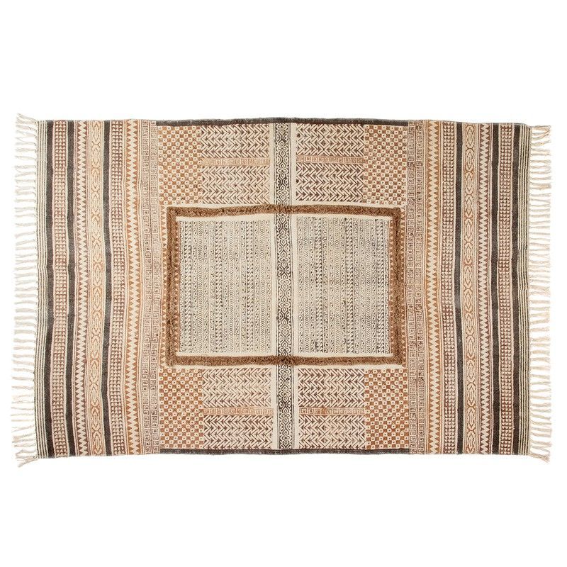 Alfombra de algodón multicolor de 180 x 120 cm con diseño patchwork en tonos neutros, ideal para decorar espacios con estilo bohemio o étnico. Fabricada con tejidos de algodón de alta calidad, presenta patrones geométricos y bordes con flecos que aportan textura y calidez. Perfecta para salones, dormitorios o terrazas, añade un toque artesanal y ac