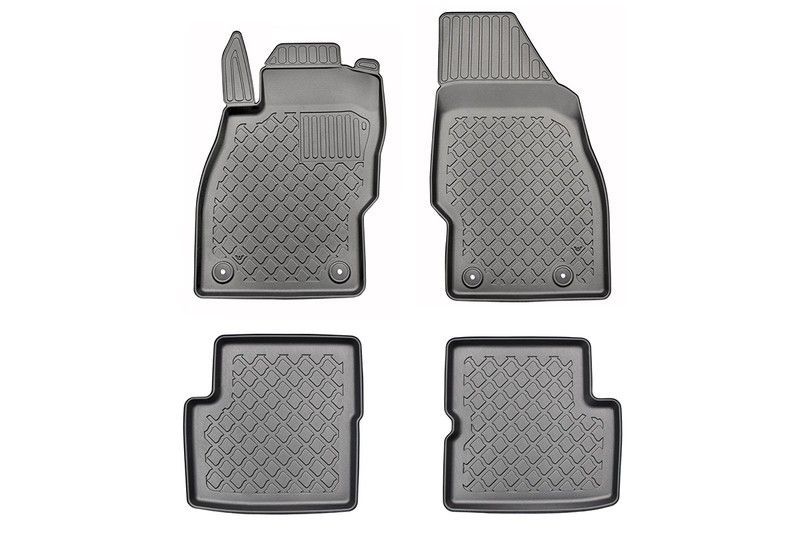 Alfombrillas 3D TPE para habitáculo de coche, en color gris, con diseño geométrico en relieve para mayor tracción y protección. Fabricadas en material TPE resistente, antideslizante y fácil de limpiar. Incluyen rebordes laterales para contener suciedad y agua, y orificios de fijación para un ajuste seguro. Ideales para conductores que buscan manten