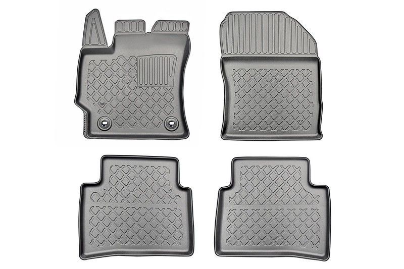 Alfombrillas 3D TPE para habitáculo de coche, en color gris, con diseño antideslizante y textura geométrica. Fabricadas en material TPE resistente, ofrecen protección completa contra suciedad, agua y desgaste. Incluyen bordes elevados y ranuras de drenaje para mantener el interior del vehículo limpio. Fáciles de instalar y mantener, ideales para co