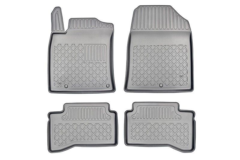 Alfombrillas 3D TPE para habitáculo, diseñadas para adaptarse perfectamente al piso del vehículo. Fabricadas en material TPE resistente, con textura geométrica de rombos y bordes con ranuras para contener agua y suciedad. Incluyen soporte para el freno de mano en la alfombra del conductor. Ideales para adultos que buscan protección y durabilidad en