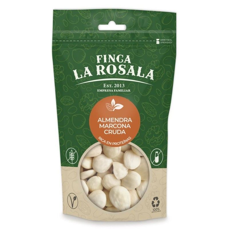 Almendras Marcona crudas y repeladas en bolsa de 150 grs de Finca La Rosala, una empresa familiar desde 2013. Ricas en proteínas, ideales como snack saludable y nutritivo. Embalaje con ventana transparente que muestra las almendras en su estado natural. Perfectas para disfrutar en cualquier momento del día.