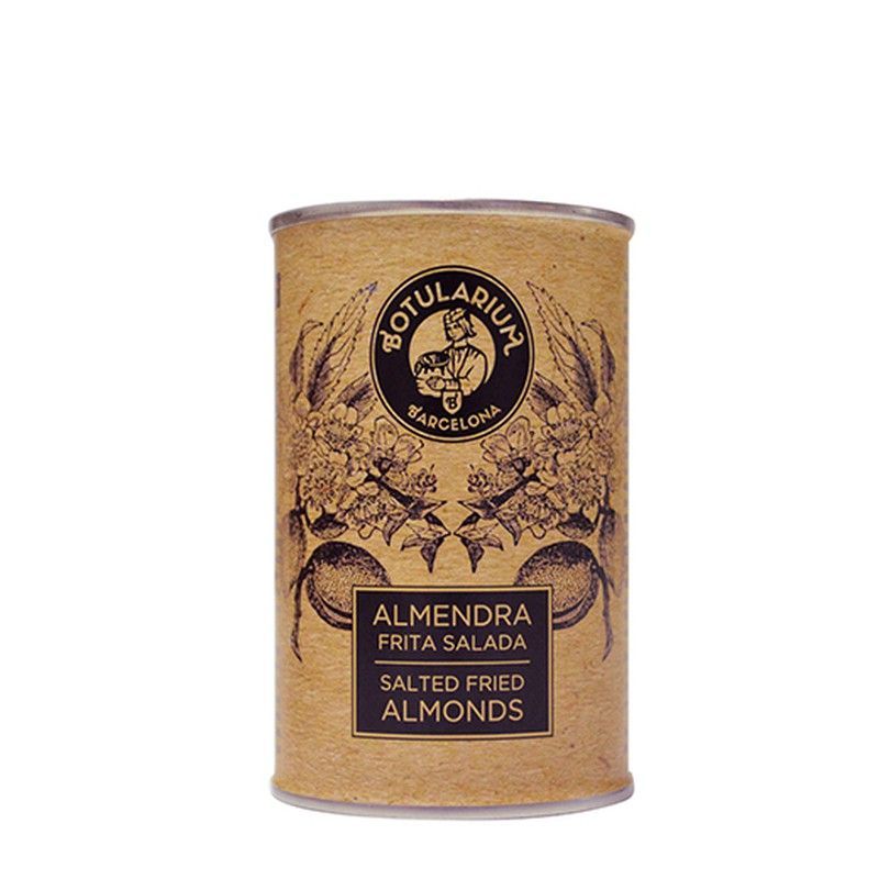 Almendras fritas saladas de Botularium, en elegante envase de cartón con diseño floral. Producto gourmet ideal para disfrutar como snack saludable o regalo sofisticado. Perfectas para amantes de frutos secos de calidad, con un toque salado y crujiente. Contenido: 150 gramos.