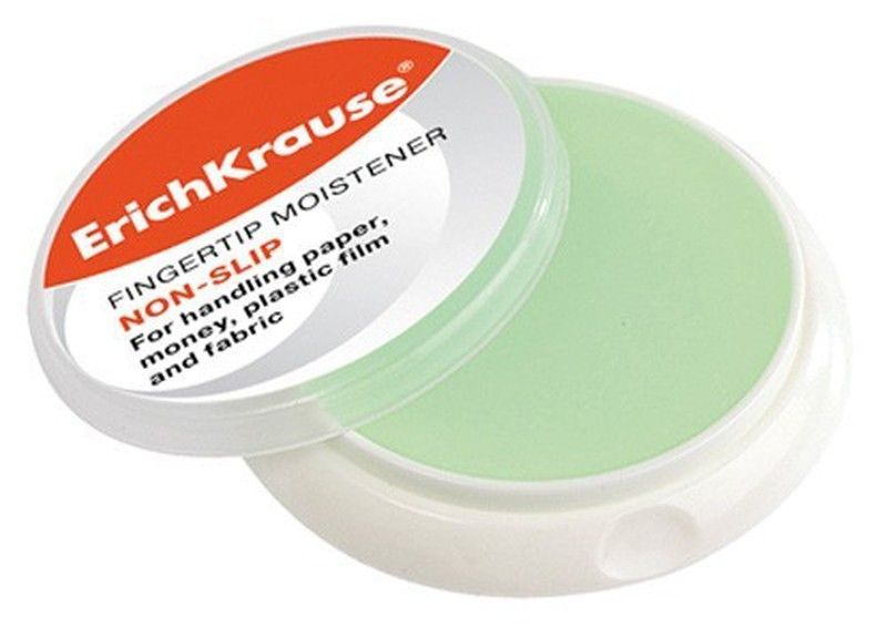 Almohadilla humedecida para los dedos ErichKrause, ideal para manipular papel, películas plásticas y tejidos sin dañarlos. Envase redondo de plástico transparente con tapa blanca y etiqueta naranja. Contenido verde claro, fácil de usar en oficinas, talleres o trabajos manuales. Mantén tus dedos hidratados y evita el deslizamiento durante tareas pre