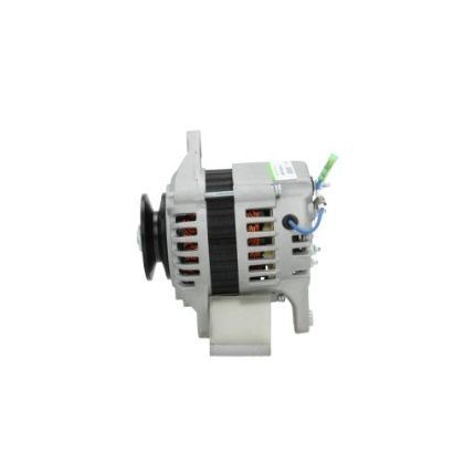 Alternador de diseño compacto con carcasa metálica gris y ventilación lateral con ranuras verticalesConector eléctrico con cable azul y terminal verdePolea negra en el extremo izquierdoEtiqueta verde con texto en la parte superior